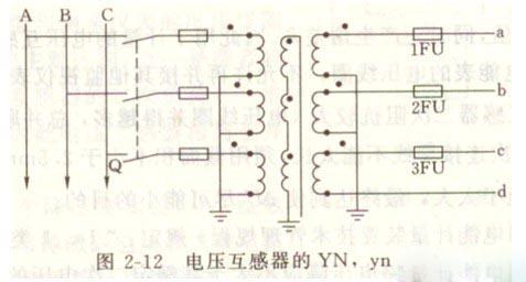 (3) 用三臺(tái)單相三繞組電壓互感器構(gòu)成YN,yn,d0或YN,y,d0的接線形式,廣泛應(yīng)用于3~220KV系統(tǒng)中,其二次繞組用于測(cè)量相間電壓和相對(duì)地電壓,輔助二次繞組接成開(kāi)口三角形,供接入交流電網(wǎng)絕緣監(jiān)視儀表和繼電器用。用一臺(tái)三相五柱式電壓互感器代替上述三個(gè)單相三繞組電壓互感器構(gòu)成的接線,除鐵芯外,其形式與圖3基本相同,一般只用于3~15KV系統(tǒng)。